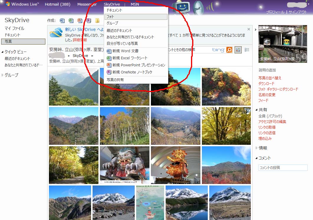 保存ファイルの統合と一覧表示の改善については、これまでファイル・文書・写真へのアクセス入口を別々に持っていたのを、メニュー「SkyDrive」に統合しました(こちらを参照)。