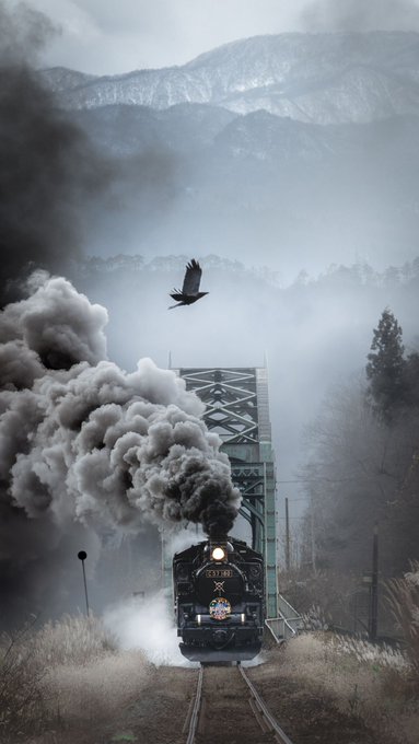 カラスを撮ろうとしていたら、偶然にもSLも撮れたとの事。この構図はこの時しかない(計画できない、スケジュールできない)というタイミングを上手く捉えています。