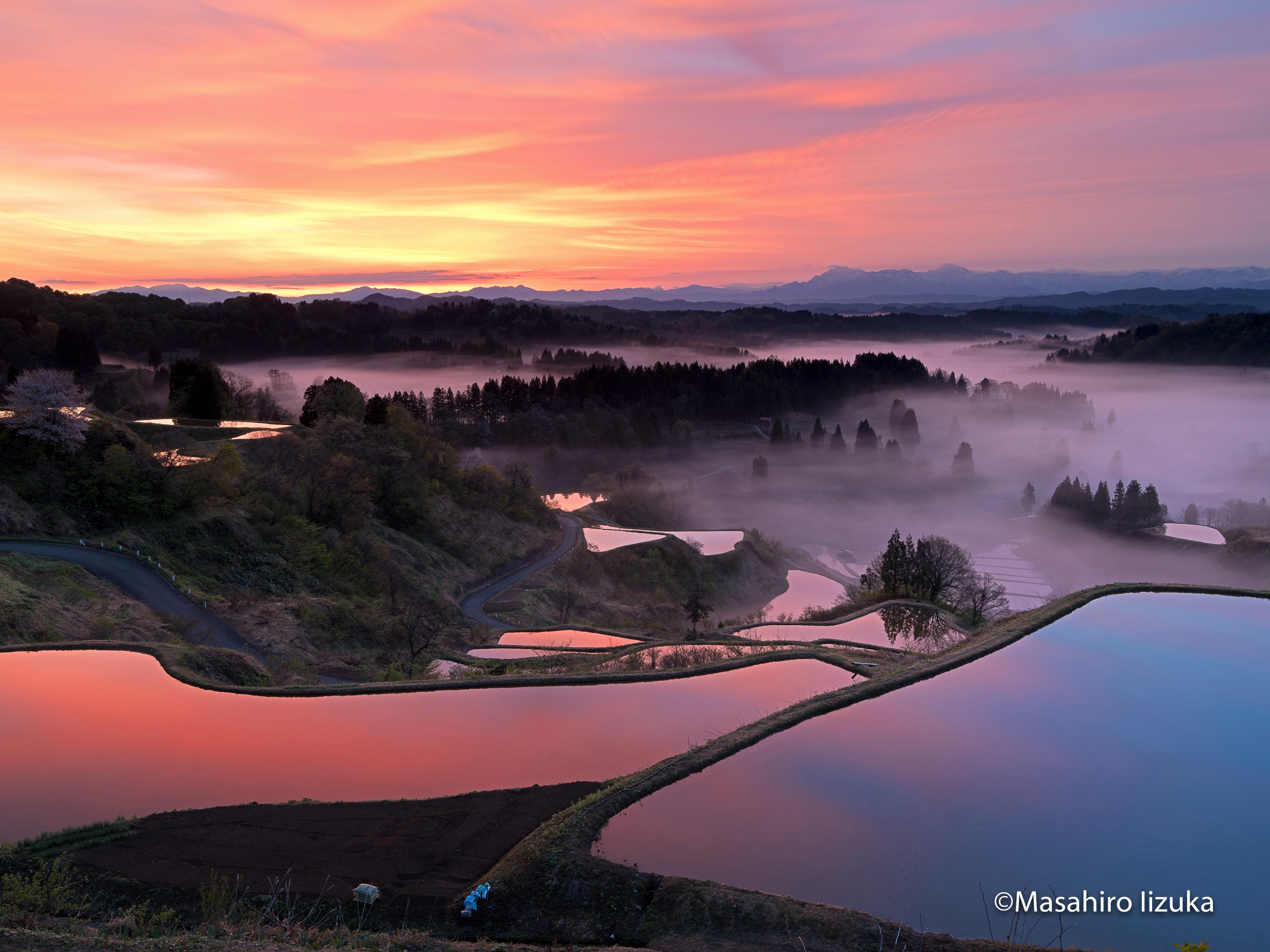 Twitterに投稿された写真「朝焼けに星峠の棚田」