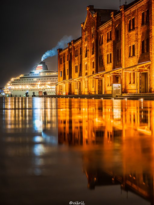 Twitterに投稿された写真「横浜赤レンガ倉庫の夜景リフレクション」