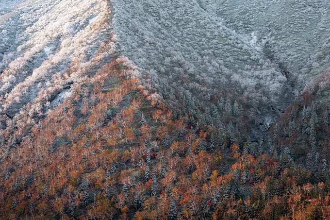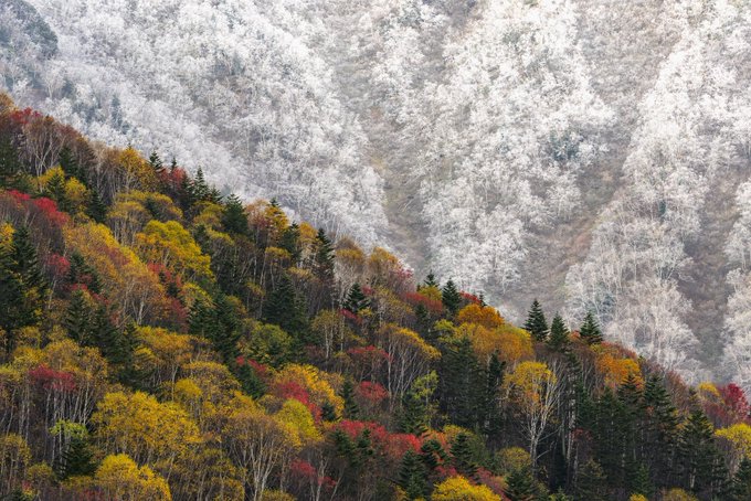 Twitterに投稿された写真「北海道 東川町の天人峡で秋と冬の狭間に柱状節理『七福岩』」