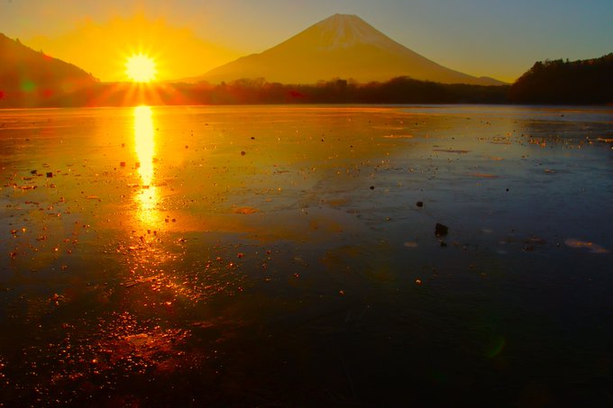 ツイッター・アカウント さとし(@ken_11041103)さん投稿の"結氷した精進湖で日の出"