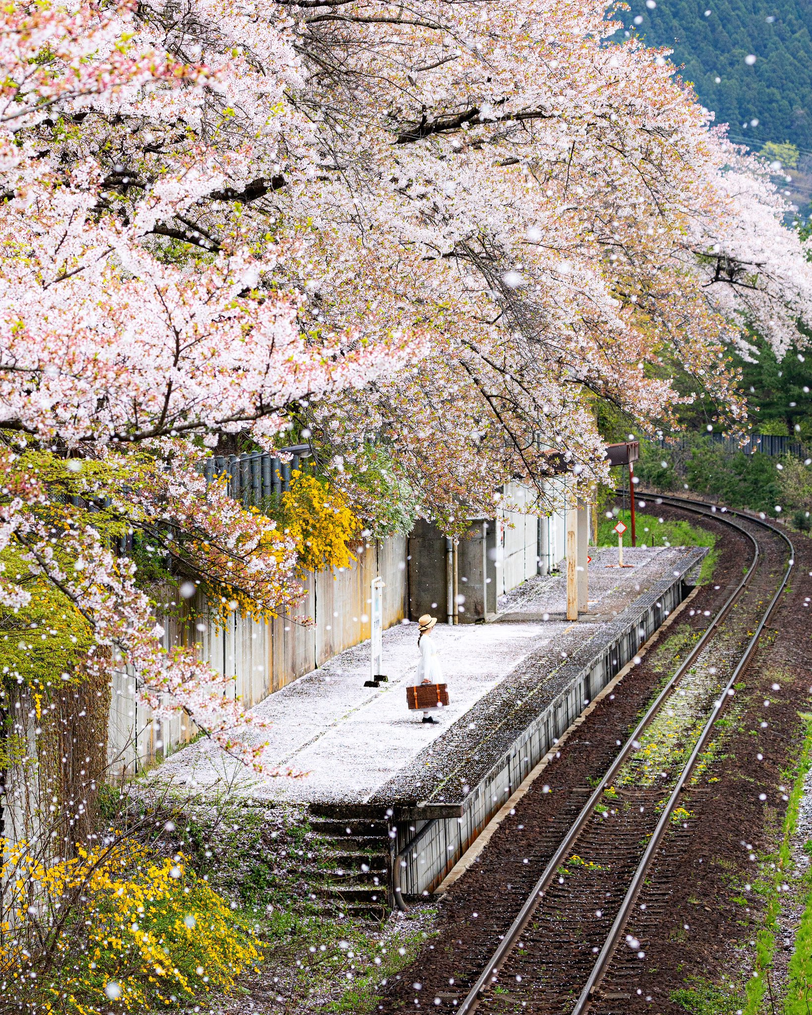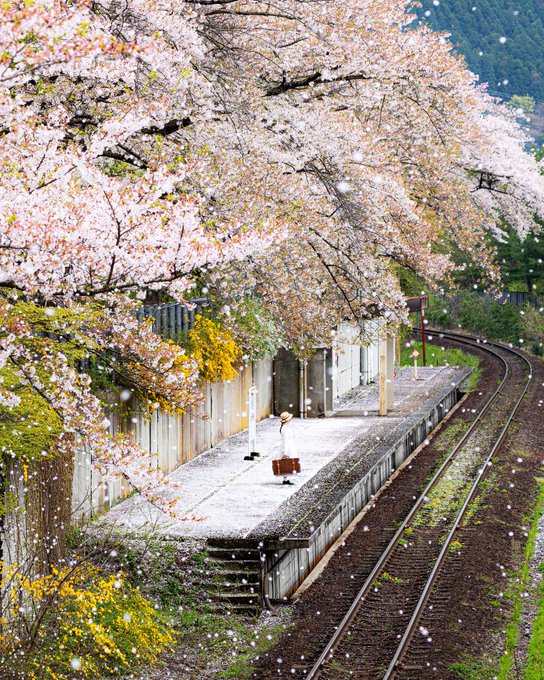 Twitterに投稿された写真「会津鉄道 🚃 で桜 🌸 散る芦ノ牧温泉南駅」