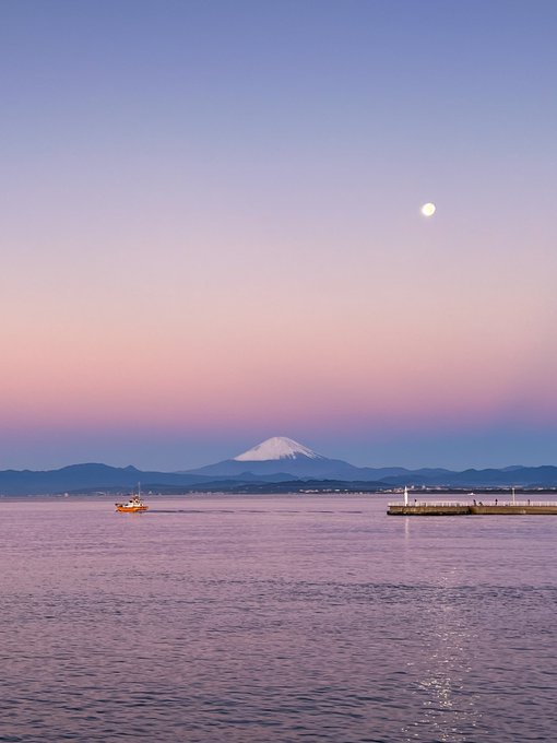 ツイッター・アカウント 早水健一(@avant0821)さん投稿の"日の出と共に出発する釣船とビーナスベルトを背景に富士山"