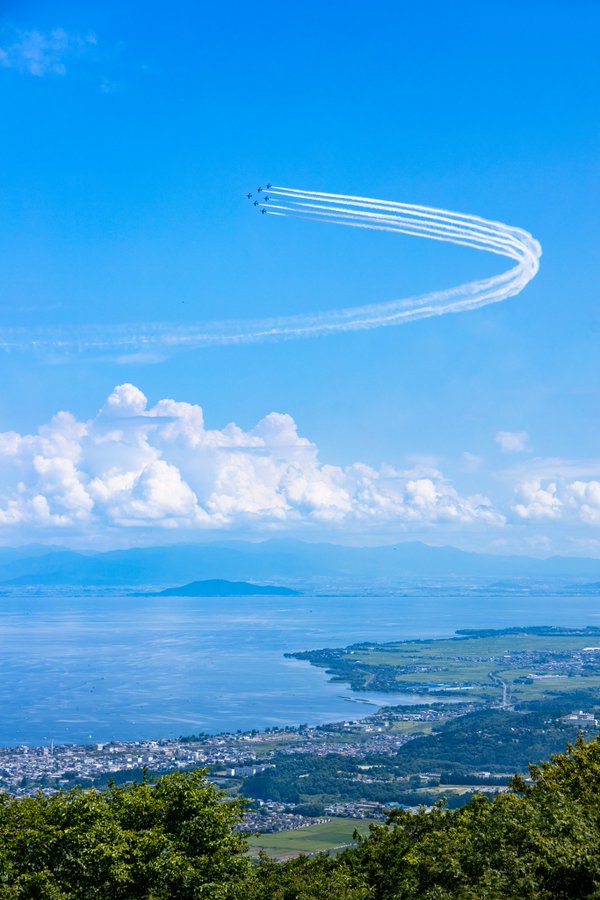 Twitterに投稿された写真「琵琶湖上空で青空に映えるブルーインパルス」