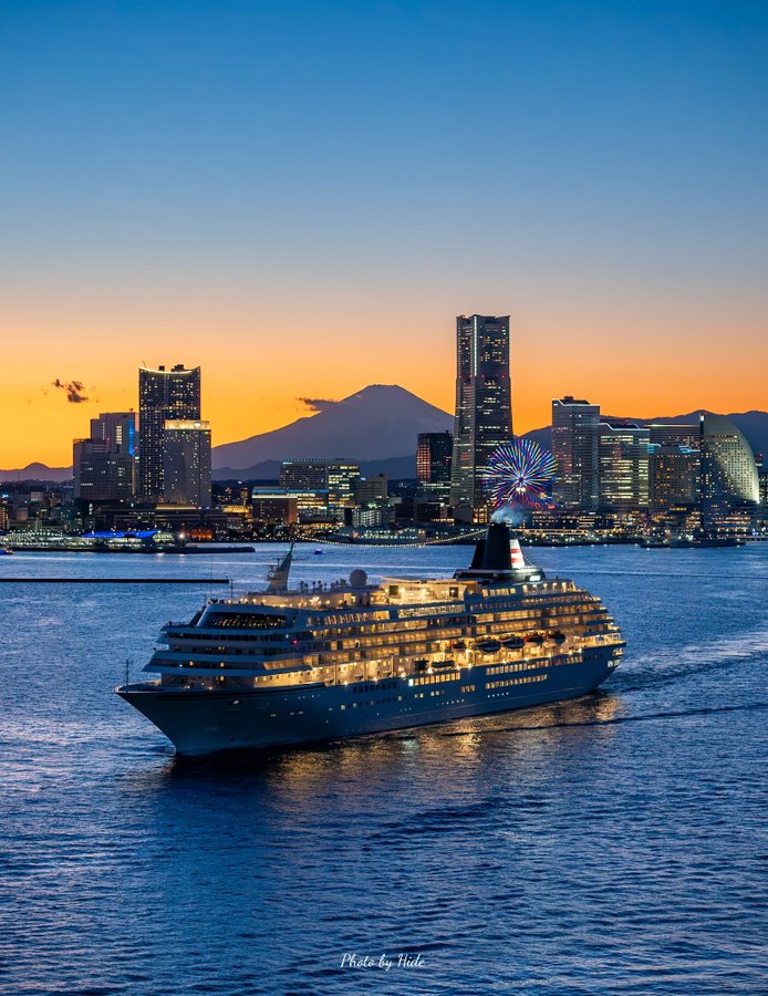 ツイッター・アカウント ひで猫(@HidePhoto_2021)さん投稿の"夕焼けに横浜みなとみらい21から富士山"