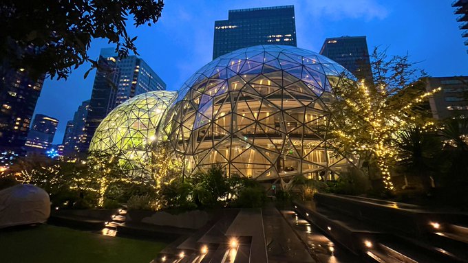 Twitterに投稿された写真「米国ワシントン州 シアトルにあるザ・スフィアズの夜景」