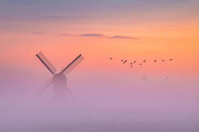 Twitterに投稿された写真「朝焼けにオランダの風景」