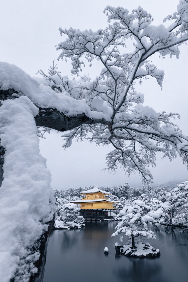 Twitterに投稿された写真「ドカ雪を受けた京都 金閣寺」