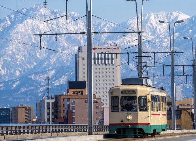 Twitterに投稿された写真「富山大橋で路面電車と立山連峰」