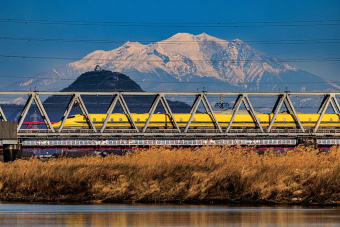 Twitterに投稿された写真「岐阜城と御嶽山、そしてラストランの『ドクターイエロー(T4編成)』」