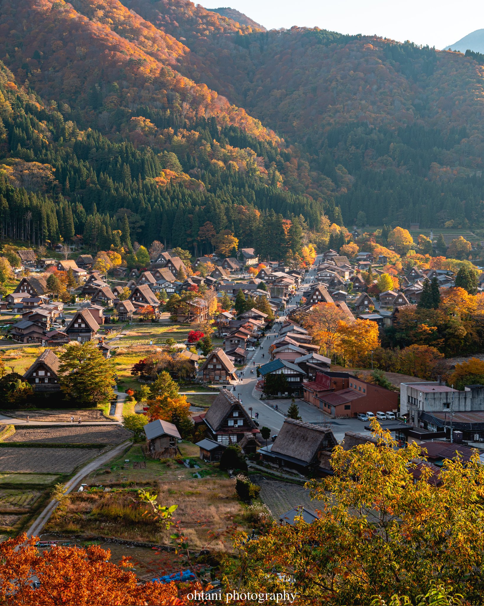Twitterに投稿された写真「山間部の早い夕暮れに紅葉も早める白川郷」